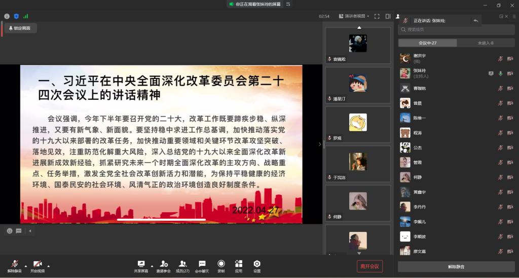 九游会j9员工一支部于2022年4月27日19:00在企业微信开展了2022年四月线上组织生活会。本次会议由张妹玲同志主持,支部全体党员参与。