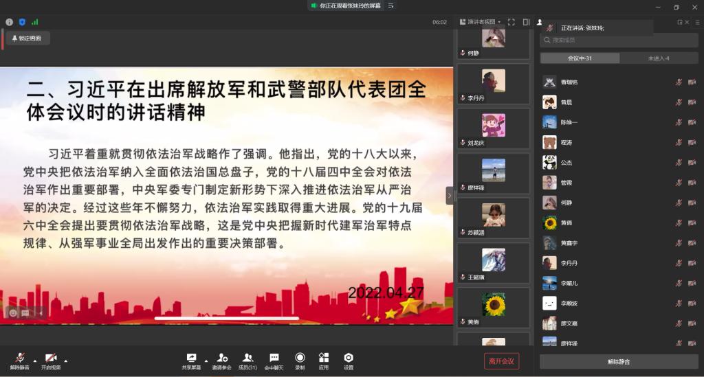 首先,由张妹玲同志领学“习近平在中央全面深化改革委员会第二十四次会议上的讲话精神”“习近平在出席解放军和武警部队代表团全体会议时的讲话精神”“习近平在中央政协工作会暨庆祝政协成立70周年大会上的讲话”“中共中央《关于推进党史学习教育常态化长效化的意见》”等四方面内容。