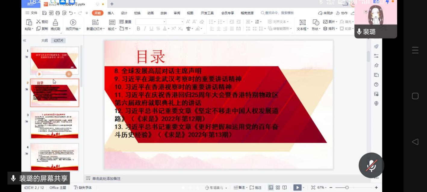 会议第二部分,由裴璐同志带领党员学习了“全球发展高层对话会主席声明(全文)”“习近平在湖北武汉考察时的重要讲话精神”“习近平在香港视察时的重要讲话精神”“习近平在庆祝香港回归祖国 25 周年大会暨香港特别行政区第六届政府就职典礼上的讲话(全文)”“习近平总书记重要文章《坚定不移走中国人权发展道路》(《求是》2022 年第 12 期)”“习近平总书记重要文章《更好把握和运用党的百年奋斗历史经验》(《求是》2022 年第 13 期)”等相关内容。着重分享了习近平同志在文章中所强调的相关内容:推进马克思主义中国化时代化,正确把握社会主要矛盾和中心任务,重视战略策略问题 ,永葆党的马克思主义政党本色 ,推进党史学习教育常态化长效化。