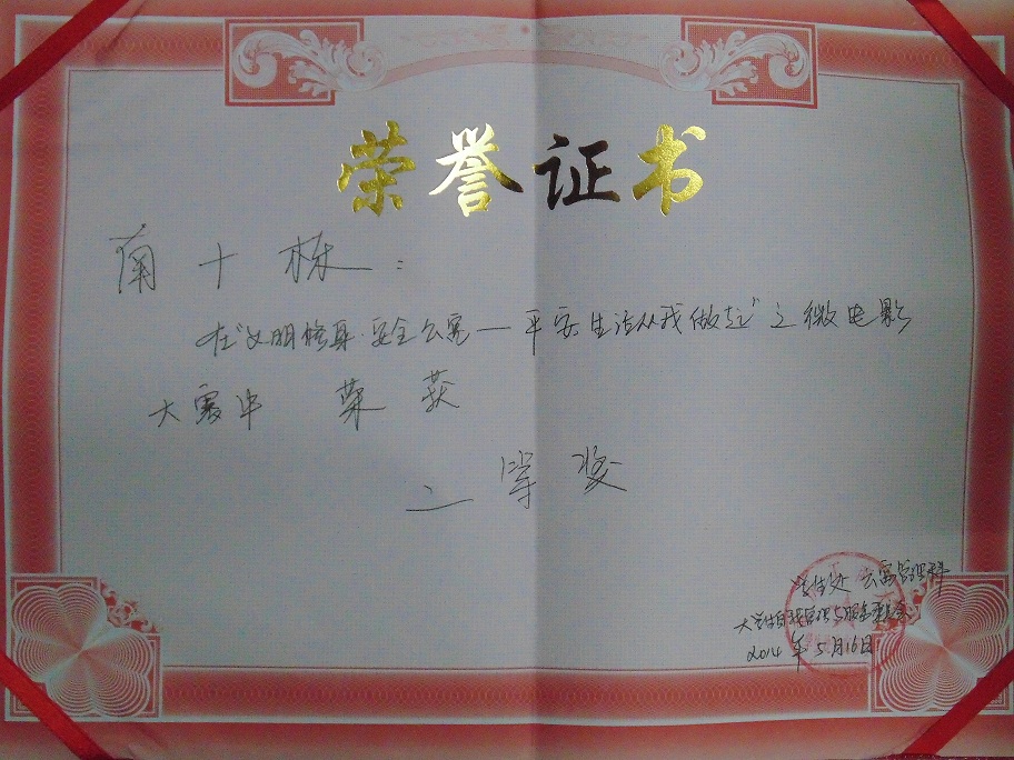 热烈祝贺公司主管南十楼栋在“文明修身·安全公寓平安生活从我做起”之微电影大赛中荣获二等奖。
