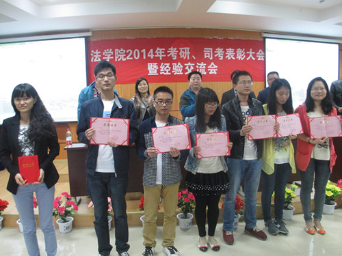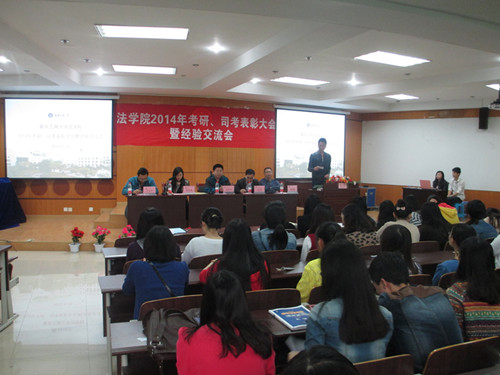 会上,首先由党总支李自维书记宣读了关于考研和司考先进个人的表彰文件及奖励办法。她提到:2014年法学院员工的考研成功率是比较高,位居全校第二,这是值得庆贺并应继续发扬的。同时她对2010级获奖的员工表示了诚挚的祝贺,也鼓励2011级的员工能再接再厉,再创法学院的辉煌。紧接着进行了司法考试和考研中突出先进个人的表彰颁奖仪式,五位颁奖嘉宾依次为他们颁发奖项并再次表示祝贺。随后经理杨和义发表了讲话,他提出“三要”,即要自信、要踏实干、要经历磨练,以此激励法学院学子努力上进。在交流环节,指导老师刘波任老师代表发表讲话,他着力强调了要多与成功学长们交流,学习他们的经验,吸取他们的教训;随后分别由考研和司考先进个人陈茜、向勇、蒋柳等学长介绍分享自己的经验,为下一届员工考研、司考提供范例。