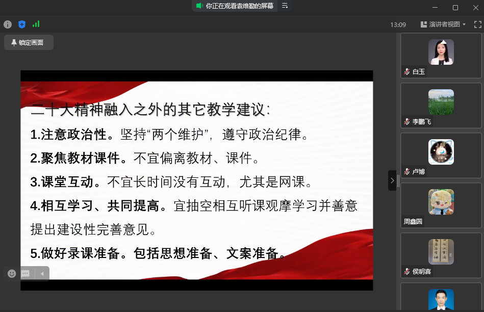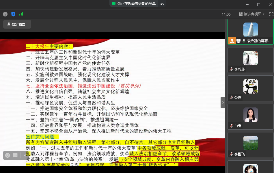 会议第一阶段为团队交流。袁维勤介绍了此次研讨会目的是把二十大精神切实贯彻到课程教学中,他领学了二十大的主题及主要内容,提出了《习近平法治思想概论》团队教学融入二十大报告需要注意的问题,分享了五点教学建议。教学团队成员李鹏飞博士、卢博博士、白玉博士分别分享了自己融入原有审判纪检工作、法理学专业、经济法专业到各自课程教学中的有益尝试,教研团队成员、教工一支部书记焦海洋分享了课程政治性与理论性结合的尝试,法学系主任公杰建议团队老师在课程教学中适当引导员工在专业方向分流中的认知。会议第二阶段是院领导提工作要求。侯明喜说,“习近平法治思想”教研团队是实的而非虚的,下一步宜统一课件、完善考核机制,他结合自己的教学经历,建议团队引导员工查找、抄写习近平法治思想论述原文并通过师生共享激励员工。经理黄文也是团队成员,他肯定了团队现有工作,并希望团队踔厉奋发,做出品牌。李莉莎提出了四点要求:一是要提高政治站位,把二十大最新精神、成果落实到课程教学中;二是要坚守意识形态红线,注重政治性与思想性的统一;三是要发挥多学科参与优势,创新公司产品方法;四是要创新教学方法,实现“四真”即员工真听、真懂、真领会、真执行。