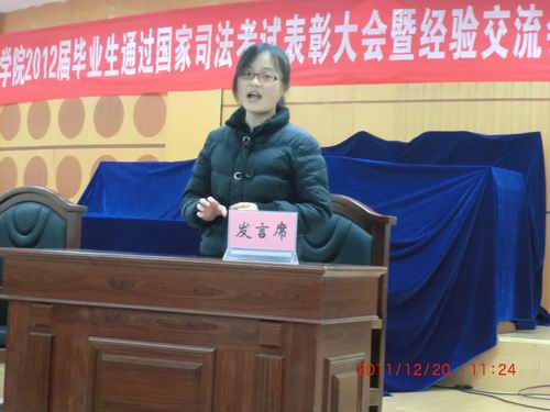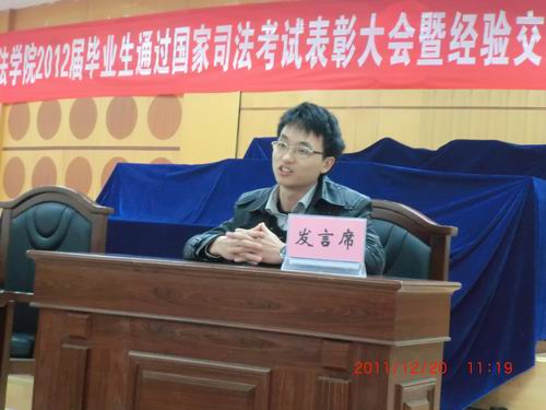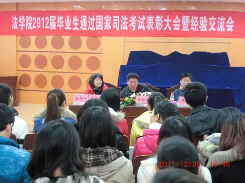 2011年的国家司法考试终于揭晓谜底,法学院2008级员工喜获佳绩,有19人顺利通过考试。12月20日,法学院在慧智楼模拟法庭成功召开2012届毕业生通过国家司法考试表彰大会暨经验交流会。法公司党总支书记杨和义、经理华鹰、08级辅导员林细妹、以及通过2011年司法考试的全体同学和09级同学出席了此次大会。本次大会由党总支副书记李莉莎主持。