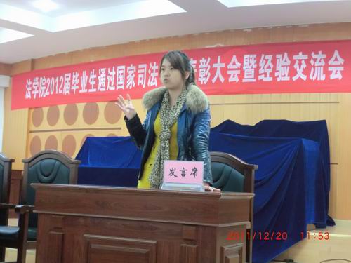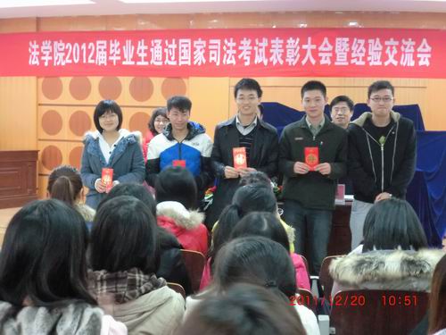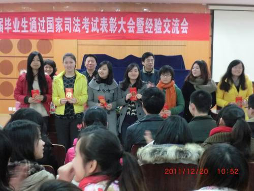 随后,杨书记宣读了法学院2011年国家司法考试通过名单。全体与会领导为本次通过司法考试的邓德兵、王书文、周菁菁、赵瑞玉、王巍然、阳季芸等19名同学予以表彰,并颁发奖金以资鼓励。