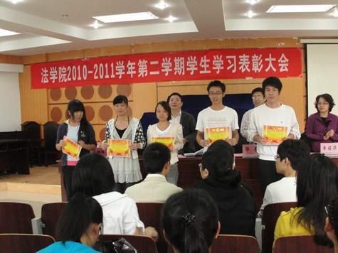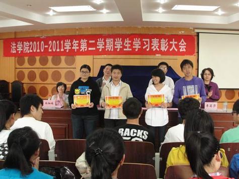 表彰大会在悠扬的校歌声中拉开了序幕。大会上,学院根据同学们在2010-2011学年第二学期的学习成绩、课堂表现等情况,分别就荣获“单科学习标兵”、“课堂学习标兵”、“学习进步奖”的个人予以表彰,同时,学院还宣读了“优秀课程组长”、“优秀速记员”以及“模拟法庭”的获奖名单并予以奖励,充分肯定了同学们所取得的突出成绩,希望大家再接再厉,“给力”学院学风建设。