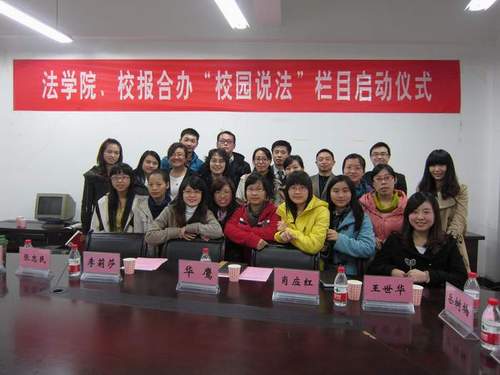 出席本次启动仪式的嘉宾有党委宣传部部长肖应红、校报编辑部主任王世华、法学院经理华鹰、法公司党总支副书记李莉莎以及“校园说法”栏目特约指导老师张忠民、钱颖萍、曾琳与全体撰稿员工。法学院分团委代理副书记黄河担任活动主持人。
