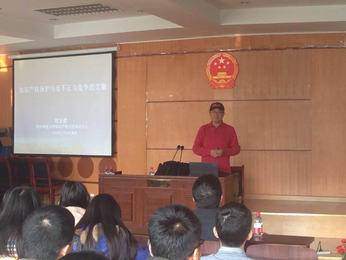 2014年12月19日下午,华中科技大学知识产权博士生导师郑友德教授应邀为ag九游会法学院师生作题为“知识产权与反不正当竞争的交集”的专题讲座。法学院百余名师生聆听了讲座。