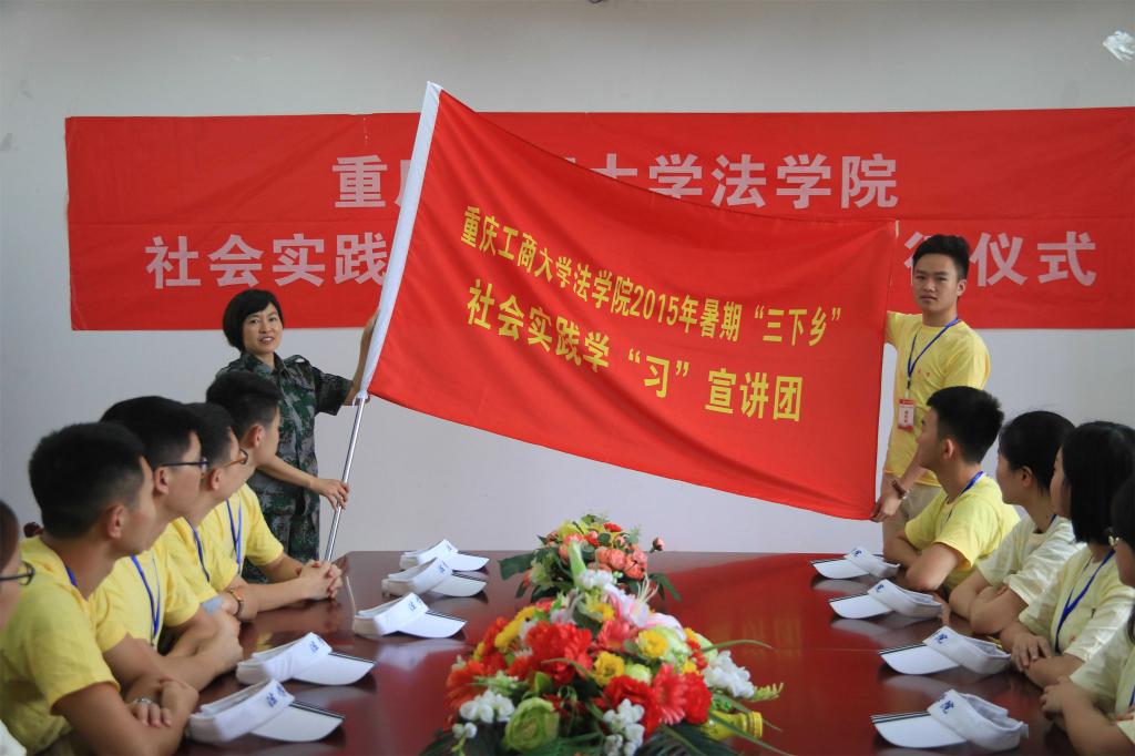 党总支书记李自维教授强调了本次“三下乡”活动的重要意义和注意事项,希望员工们可以“发挥知识技能的优势,为基层群众服务。走进社区,用我们的专业特色,去弘扬法治建设,以点带面宣传习总书记的依法治国精神,并在服务基层群众的实践中接触社会。”紧接着,分团委杨婷书记则着重强调了活动的日程安排和安全问题,同时对活动进行了具体安排。最后,李书记为本次学“习”宣讲团授旗,并预祝本次社会实践活动圆满成功。
