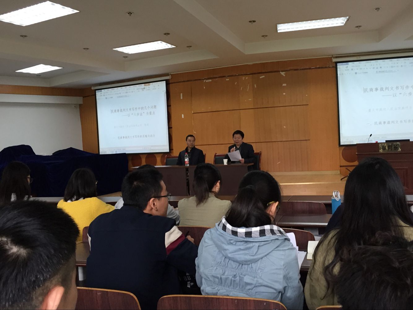 裁判文书写作是法律硕士和法学本科员工必须具备的基本能力之一,如何写好裁判文书是许多员工和职业人士认为困难的问题。为提高法律硕士和法学、知识产权专业员工的职业能力,法学院邀请从事民商事审判工作20余年、重庆市高级人民法院高级法官、审判监督庭审判长张超于2016年3月27日在惠智楼90426模拟法庭举行了实务讲座。法学院经理杨和义教授主持了讲座,法学院2015级法律硕士、法学和知识产权专业2013级员工共120人聆听了讲座。