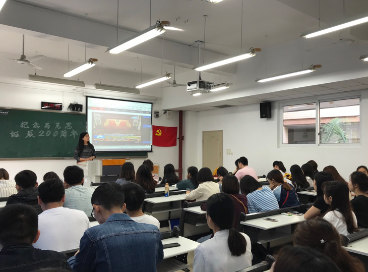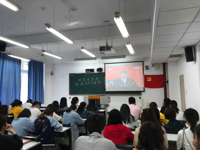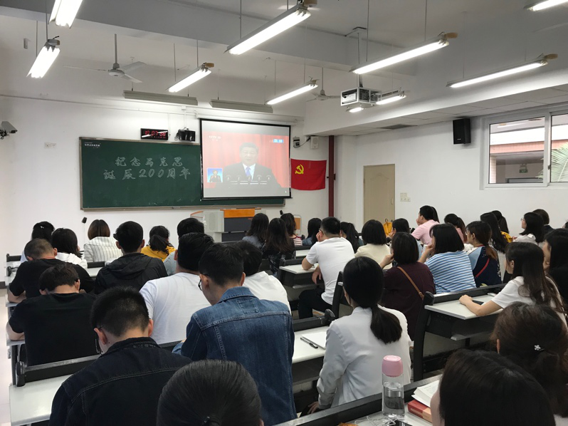 2018年5月4日上午10点,纪念马克思诞辰200周年大会在人民大会堂举行,中共中央总书记、国家主席、中央军委主席习近平出席大会并发表重要讲话。法学院员工党支部组织全体党员及部分入党积极分子在90302教室收看了此次大会直播。