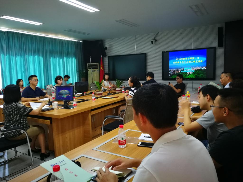 李自维书记首先向大家通报了法学院法律硕士专业学位点专项评估结果,并对老师们在人才培养过程中的辛勤付出表示感谢。接着,李书记以图文并茂的形式组织全院教职工共同学习了公司党委中心组(扩大会议)学习会暨中层干部大会精神,详细解读了学校新学期工作要点、工作要求,部署了法学院2018年下半年工作计划及工作思路。