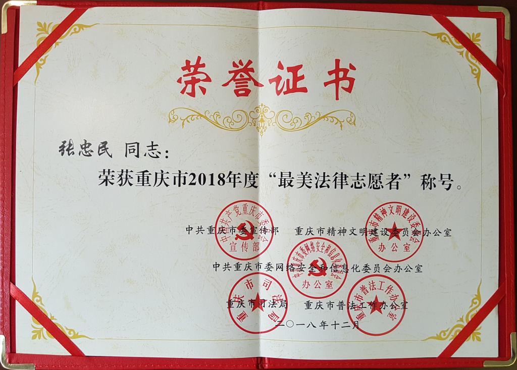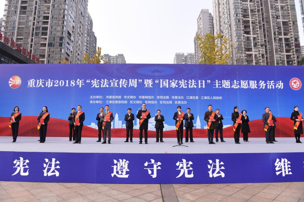 今年12月4日是我国第五个“国家宪法日”,重庆市2018年“宪法宣传周”暨“国家宪法日”主题志愿服务活动在江津区启动。启动仪式上,现场为第二届“重庆十大法治人物”、2018年度重庆“最美法律志愿者”、重庆市“我执法我普法”演讲比赛,以及获得2018年度“中国十大法治人物”的获奖代表颁奖。其中,法学院张忠民教授等10人荣获重庆市2018年度“最美法律志愿者”称号。
