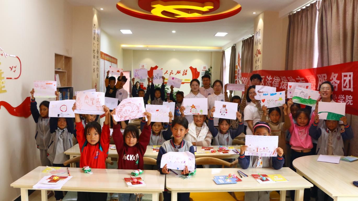 彝族老员工志愿者将凉山地区民谣改编为普法歌谣教唱,以彝韵伴普法,以法治暖人心。团队围绕《民法典》及《未成年人保护法》展开宣讲,带来以“反家暴”为主题的普法情景剧表演,从保障未成年人权益、预防未成年人犯罪等方面教会小朋友们演绎模拟法庭,在原告、被告、法警等角色的扮演中感受法庭审判程序,坚定社会主义法治信仰。宣讲结束后,老员工志愿者组织小朋友们开展反诈知识竞答活动,进一步提升青少年法治意识。小朋友们在志愿者的引导下绘制出“我心中的法治凉山”,用手中画笔描绘出凉山彝区的法治蓝图。