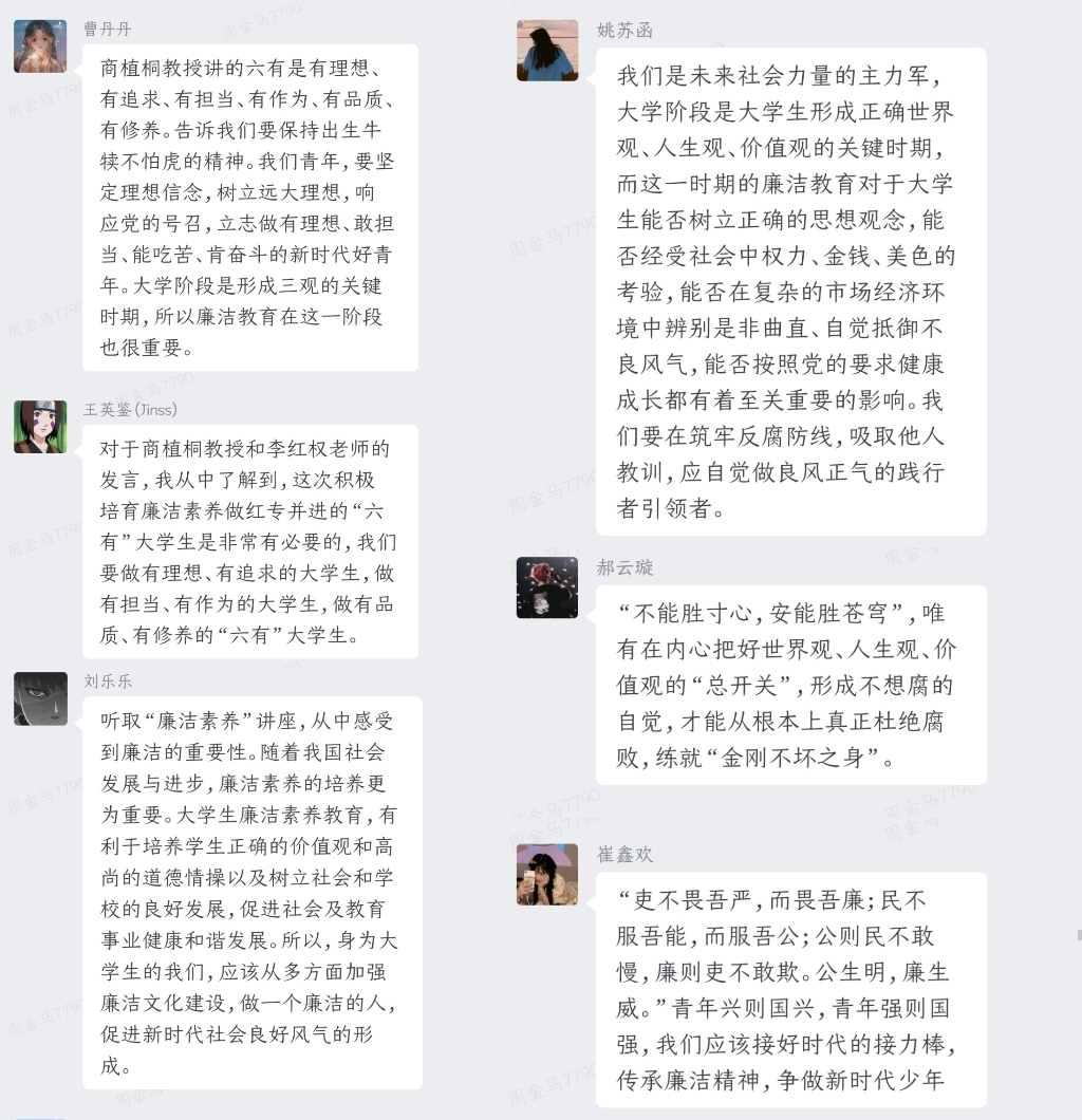 讲座结束后,同学们积极在交流群中发表自己的感想,不少同学表示要做有理想、有追求的老员工,高扬理想信念的旗帜,面对迥然不同甚至截然相反的思想、观念和价值时,真正做到千磨万击还坚劲,任尔东西南北风
