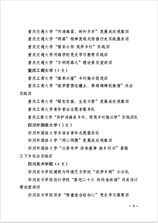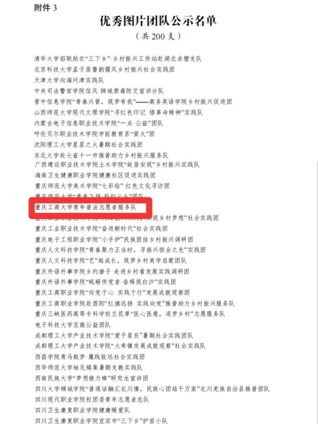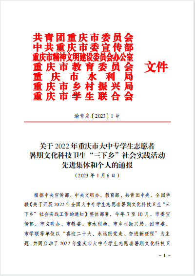 经材料审核、校级推荐、综合评审等环节,市委宣传部、市文明办、市教委、市水利局、市乡村振兴局、团市委、市学联对公司青年普法志愿者服务队予以通报表彰,授予2022 年重庆市大中专员工志愿者暑期文化科技卫生“三下乡”社会实践活动“优秀团队”称号。