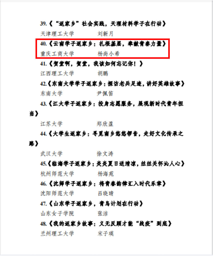 经报名审核、作品发布、网络展示、综合评审等环节,在共青团中央青年发展部、中国青年报、中国青年网共同举办的2022年“镜头中的三下乡”征集活动中,公司青年普法志愿者服务队荣获“全国优秀图片团队”奖项。在共青团中央青年发展部、中国青年报、中国青年网共同举办的2022年“我的返家乡实践故事”征集活动中,2020级社会学专业杨尚小希作品《云南学子返家乡:扎根基层,奉献青春力量》荣获全国优秀作品。