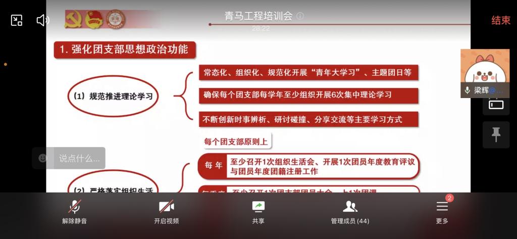 梁辉从学习宣传贯彻党的二十大精神入手,总结归纳了高校团学改革中的痛点和难点。同时,他全面详细的为大家解读了《关于改革创新高校共青团工作 切实增强思想政治引领实效的若干措施》《关于巩固高校员工会(研究生会)改革成果的若干措施》等最新文件,也同大家一起分享了青马工程、一校一品、挑战杯、校园之春等高校共青团工作中的品牌活动。