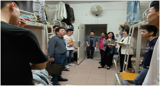 2019年5月30日晚上,法公司党总支书记李自维、法学院经理杨和义、法公司党总支副书记林璐以及辅导员刘鑫、陈丹妮来到南岸校区南区十幢员工宿舍,通过了解、关心正处于考研、法考阶段的员工的学习、生活情况,并对宿舍安全卫生、寝室学风建设等方面进行了走访检查。