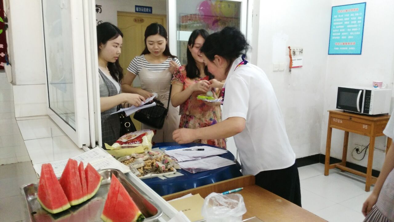 在这一天,有着十多年丰富楼管经验的寝室阿姨代红老师和楼栋干部早早地在大门处等待来办理离校手续的大四毕业生们。在代红阿姨的带领下,把这离别伤感时分变得温情无比。黑板上写着温馨的提示语,大门处布置得恰到好处。阿姨自掏腰包,买来大西瓜,西瓜是圆的,代表着毕业生们进入社会顺顺利利,一帆风顺;打开的西瓜,内瓤是红的,寓意她们以后的日子将红红火火。不仅买了瓜,还有咸鸭蛋和饼作为南十六B1毕业生的赠别礼物。可别小瞧这些东西啊,可都很实用呢,想想这整理、搬离寝室本就是耗力劳神的事儿,一块西瓜能解渴,一个咸蛋和饼能饱腹啊。再小的东西也是心意啊,代红阿姨真真是用心良苦,细致入微啊。本是惜别伤感之时,却意外的充满温馨。