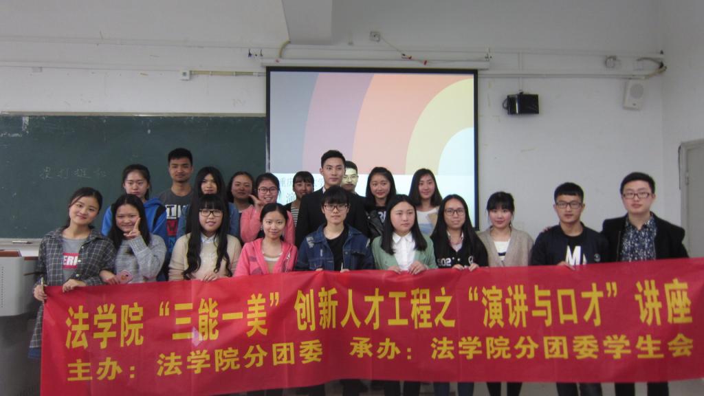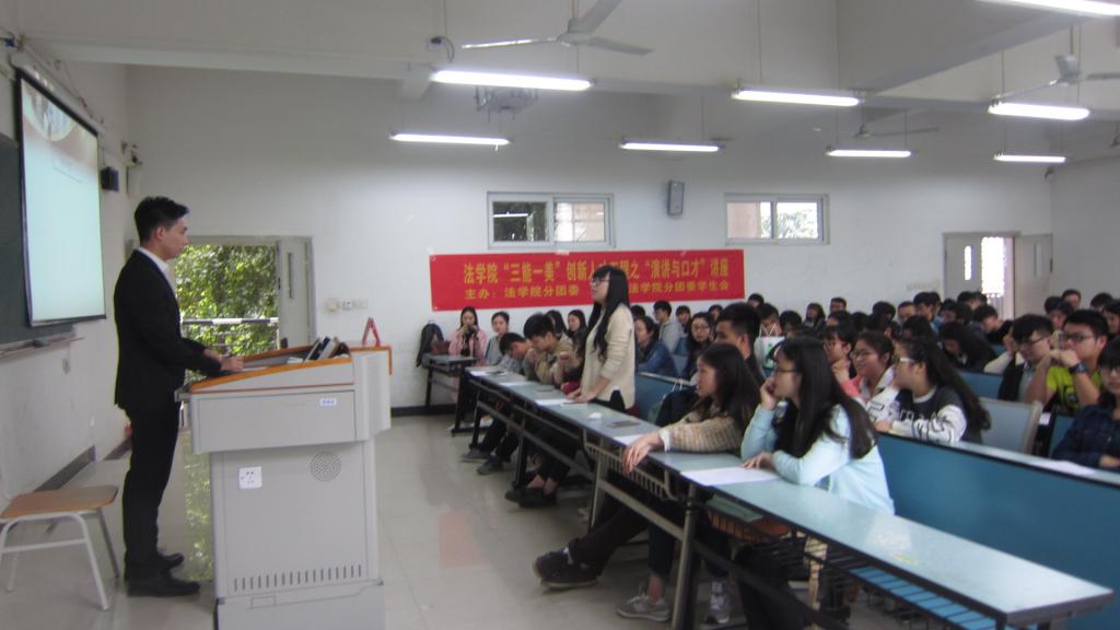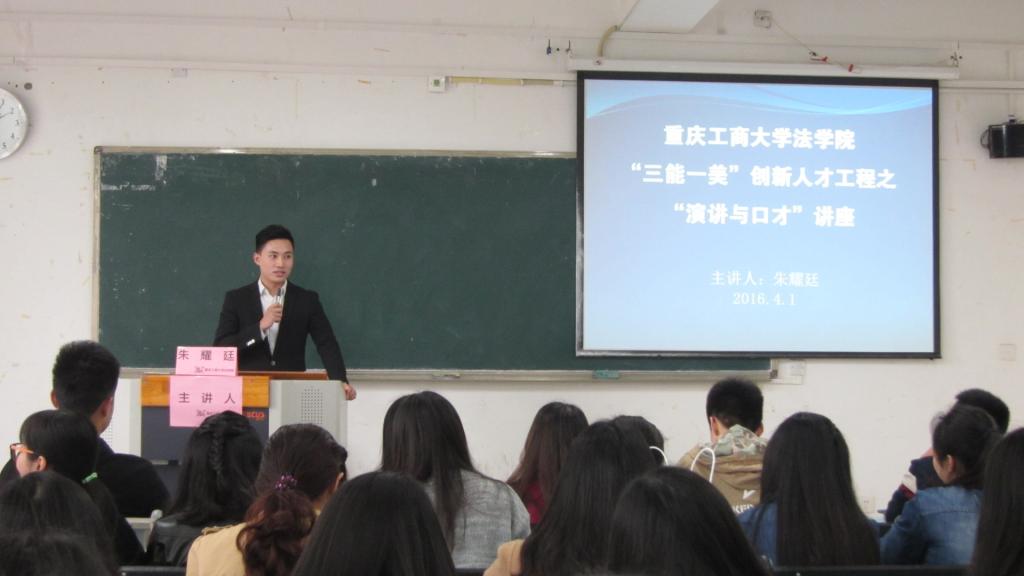 为了提高同学们的演讲与口才能力,201641日下午2:00,在兰花湖校区广智楼213教室举办了一场由法学院分团委主办,法学院分团委员工会承办的“三能一美”创新人才工程之“演讲与口才”主题讲座。本次讲座有幸邀请到了重庆卫视主持人朱耀廷担任此次讲座的主讲人,同学们也都积极参与到了这次讲座中来。