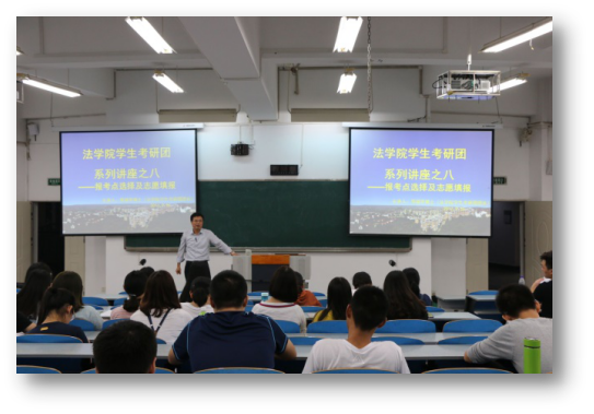 为了进一步提高公司员工的考研热情,明确考研目标,掌握相关考研技巧,了解更多考研信息,2017年9月25日晚19:00,法学院在慧智楼90326教室举行了“法学院考研团系列讲座之八——报考点选择及志愿填报”。本次讲座,由法学院员工考研团团长、党总支副书记简福平博士主讲,法学院员工考研团副团长、学团办副主任刘鑫老师及全体考研团成员、14级即将参加考研的同学参加了本次讲座。