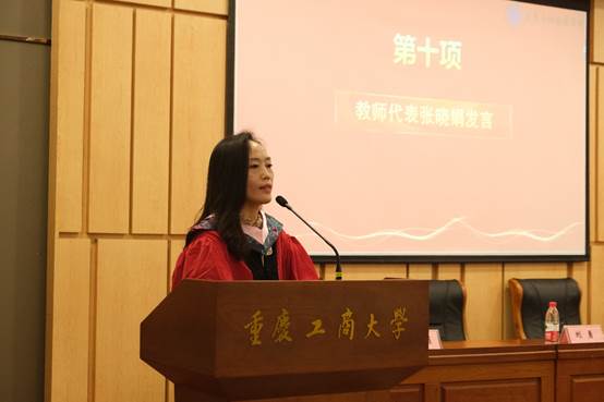 教师代表张晓娟进行了发言,她对同学们顺利完成学业表示祝贺,并希望同学们珍惜时光、阳光向上,有空常回母校看看。