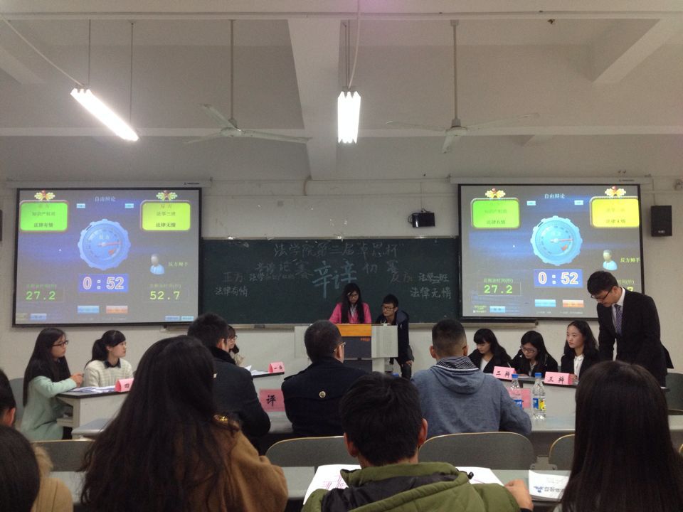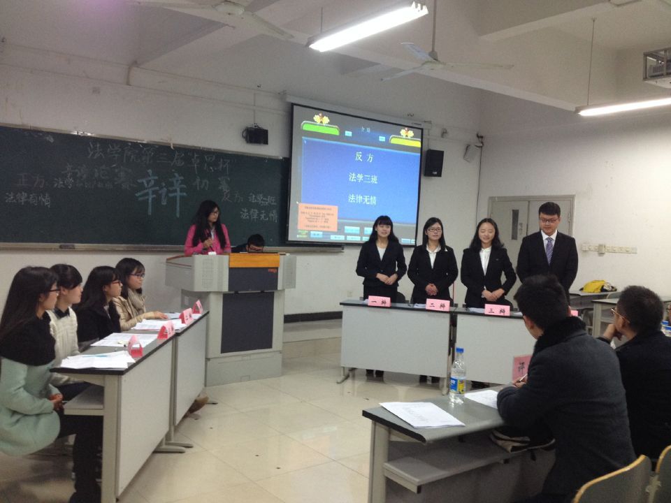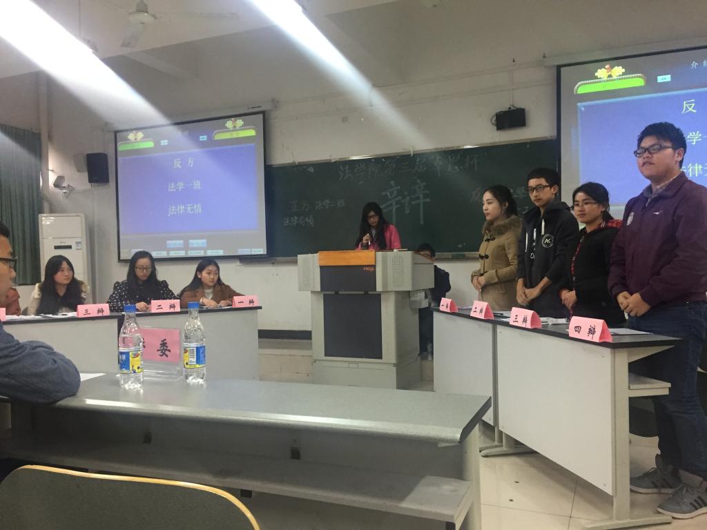 20151216   法学院就“法律有情还是法律无情”开展了辩论赛,参赛班级有:法学一班、法学二班、法学三班以及知识产权班。这四个班级将于下午的5点至7点在兰花湖20307教室展开激烈的角逐赛。