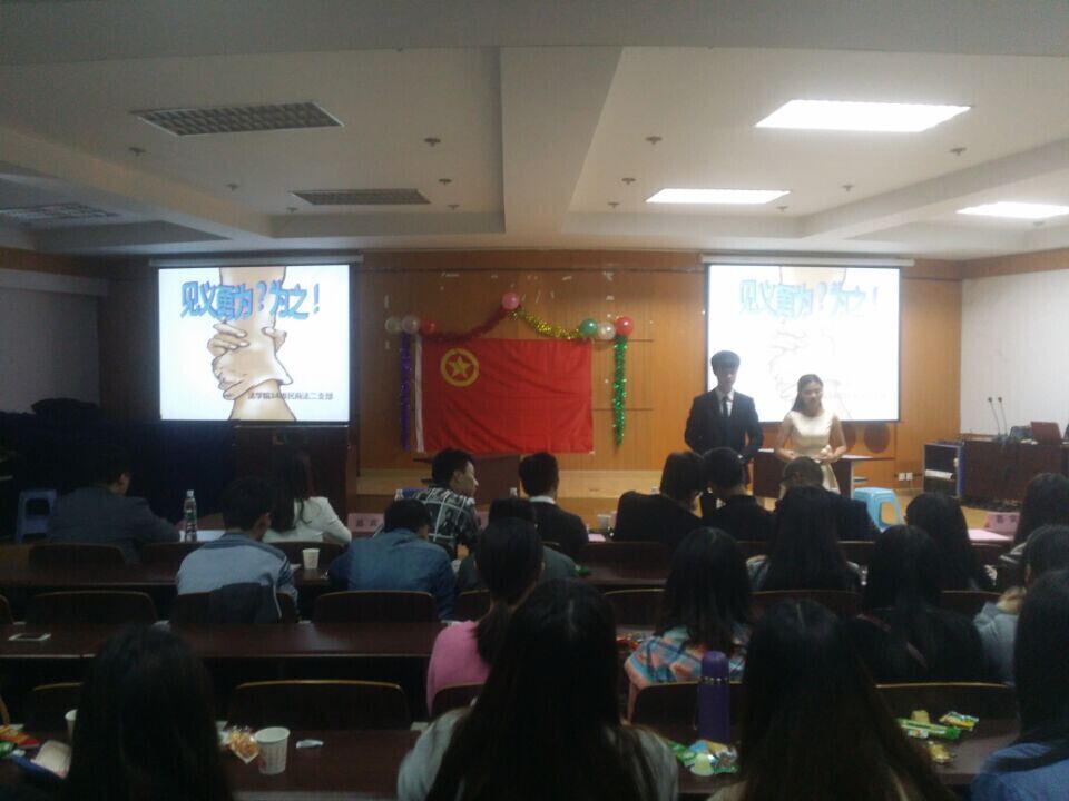 为发扬中华民族传统美德,2014级民商法二支部积极响应团委号召。2015112318:0019:00,在模拟法庭90426开展了关于“坚强诚毅困愈挺,见义勇为敢担当”为主题的团日活动。