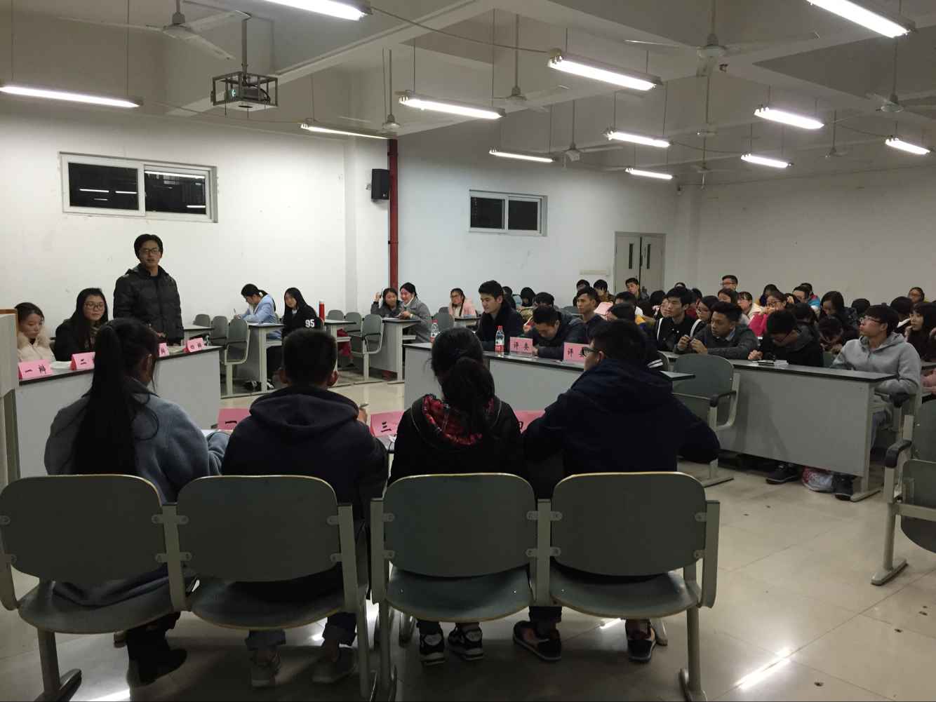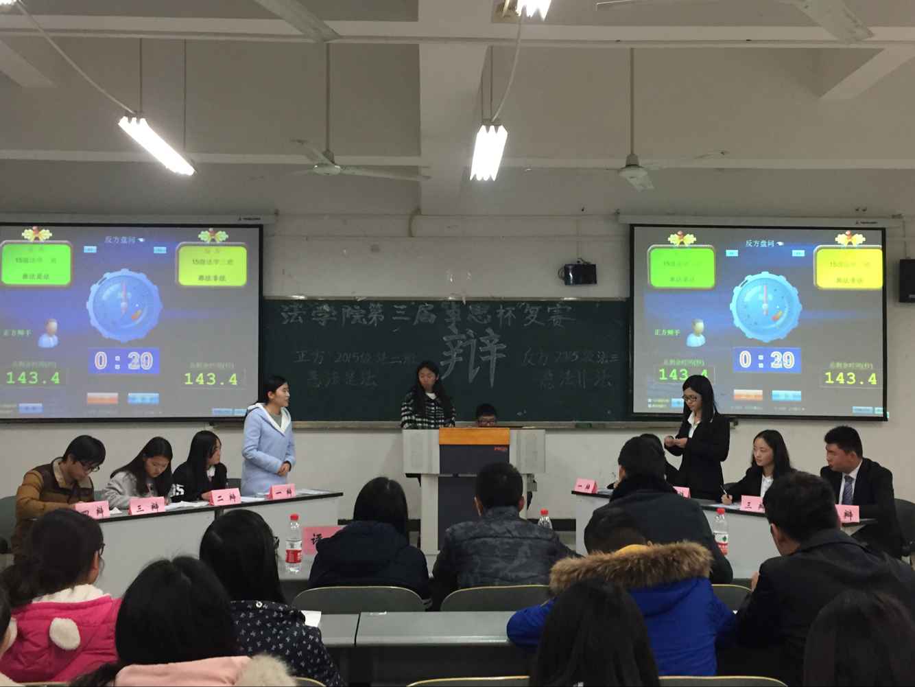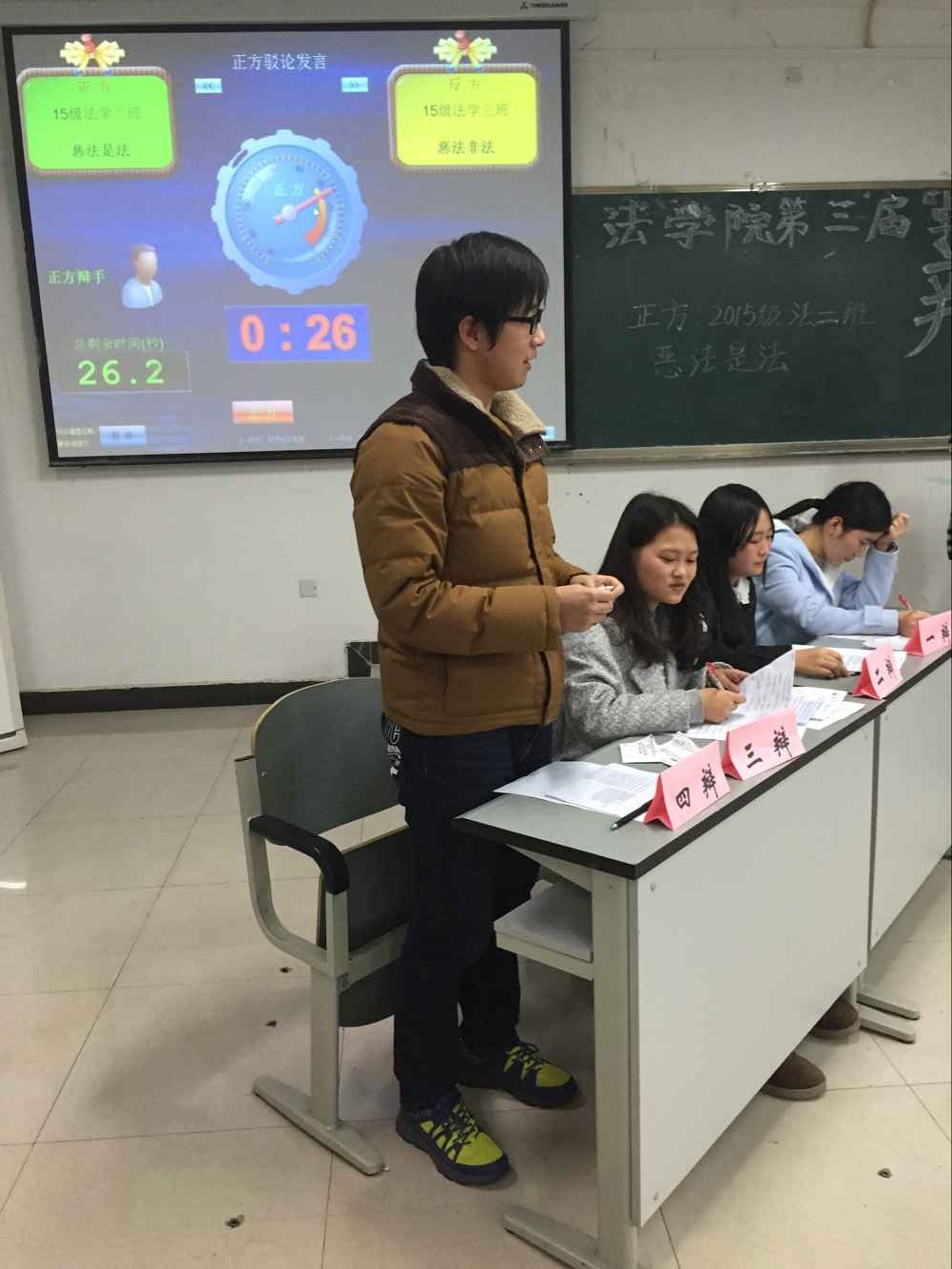 2015     1223 下午630,法学院以“恶法是否为法”为辩题在兰花湖校区20307教室准时开展了激烈的辩论赛。15级法学一班、14级电商法班、15级法学二班和15级法学三班参与了本次复赛。法学院分团委员工会主席郑银、副主席许大勇和口才协会会长刘兆蓉担任了本次比赛的评委。